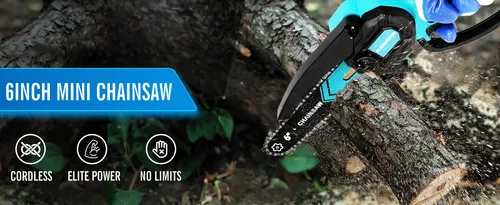 🪚 POWERFUL MINI CHAINSAW: Meet Our Cordless Mini Chain saw, compact & strong for wood cutting, trimming, etc. With 2pcs 6-inch chains and pure cooper motor, it cuts branches easily, ideal for courtyard, home, & garden tasks.