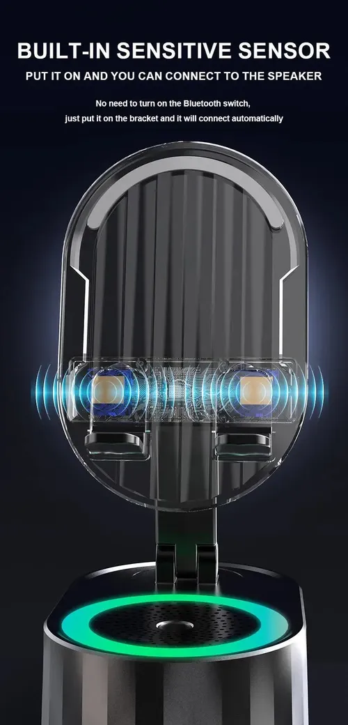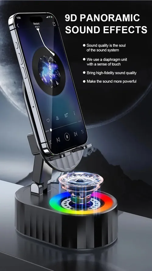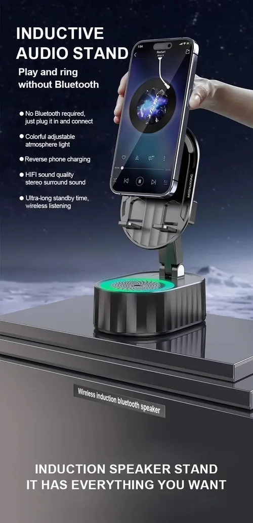 ❤️ 5-in-1 Multifunctional Design: More than just a speaker! induction bluetooth speaker also serves as a wireless charger, adjustable phone stand, ambient light, and a powerful Bluetooth speaker.